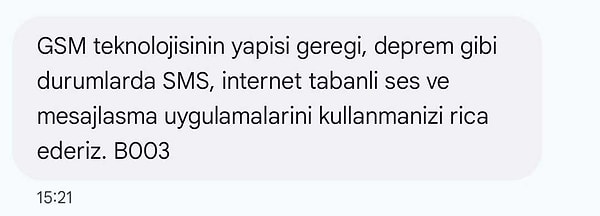 GSM Operatörlerinden biri, kullanıcılarına SMS atarak “deprem üzere durumlarda internet tabanlı iletileşme uygulamalarını” kullanmaları konusunda ricada bulundu.