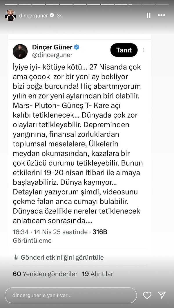 Popüler astrolog Dinçer Güner, 14 Nisan’da zelzele olacağının haberini verdiğini belirtti.