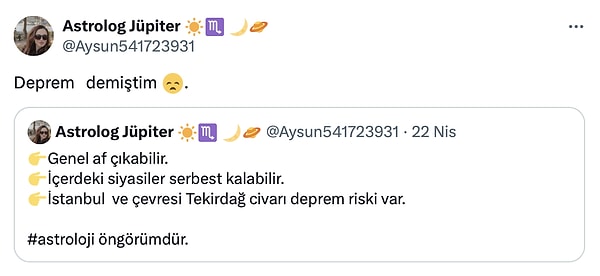 Karma Astrolog Aysun, 22 Nisan’da yaptığı paylaşımda İstanbul ve Tekirdağ civarı zelzele riski açıklaması yapmıştı. 👇