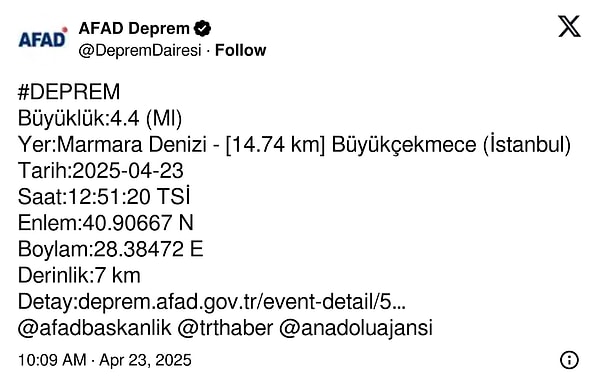 AFAD, zelzelenin büyüklüğünü 6.2, merkez üssünü Silivri olarak açıkladı. Zelzeleden sonra 4.4 büyüklüğünde artçı sarsıntı de meydana geldi.
