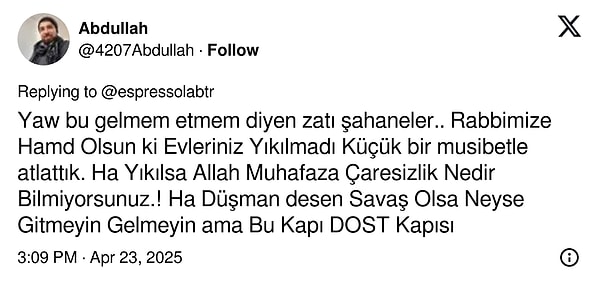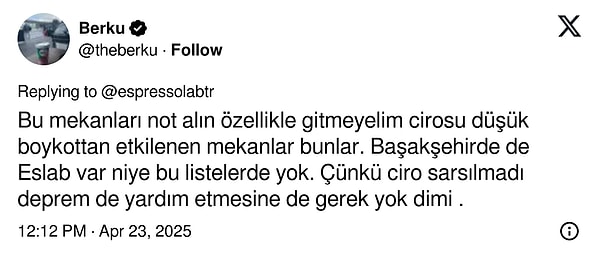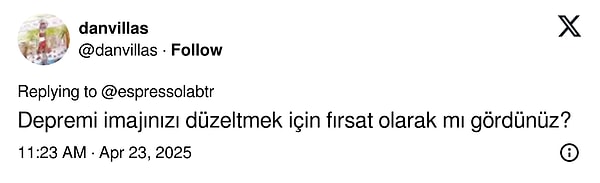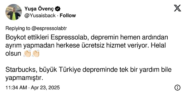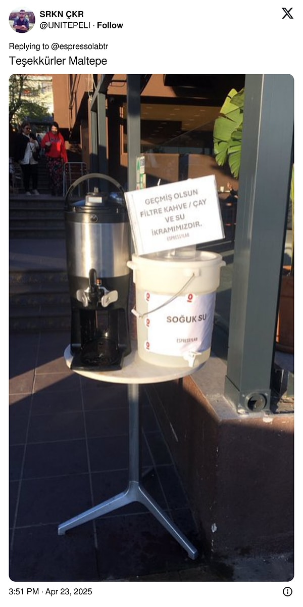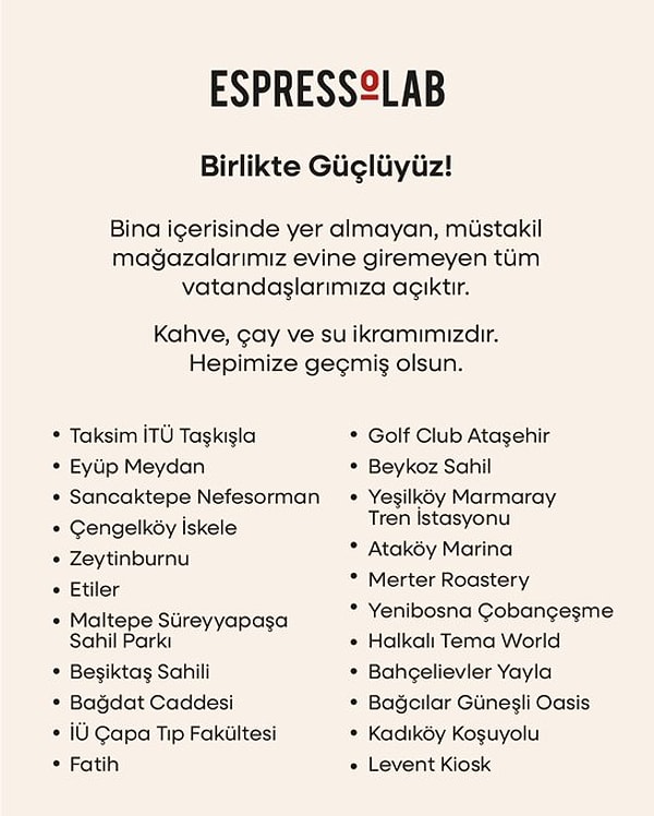 Espressolab, bugünkü sarsıntının akabinde da bir paylaşım yayınladı. ‘Bina içerisinde yer almayan, müstakil mağazalarımız sarsıntı sebebiyle konutuna giremeyen tüm vatandaşlarımıza açıktır.’ diyen markaya toplumsal medyada hem olumlu hem olumsuz yansılar vardı.