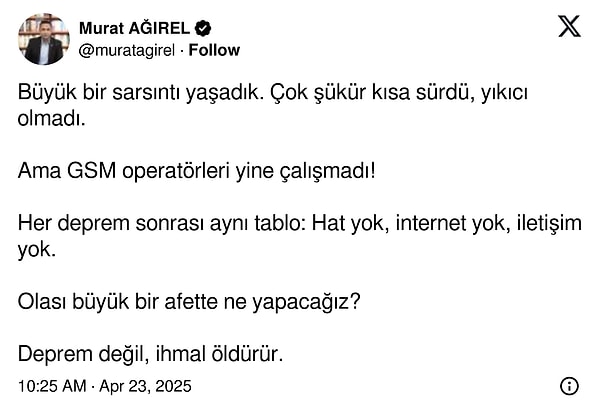 Marmara Denizi’nde gerçekleşen ve büyük paniğe neden olan 6.1 büyüklüğündeki sarsıntının akabinde beşerler sevdiklerini ve yakınlarının durumunu sormak için telefonlarına başvurdu. Fakat bir Türkiye klasiği denebilecek halde GSM operatörleri bu zelzelede de sınıfta kaldı. Toplumsal medyada tüm operatörlere reaksiyonlar gecikmedi.