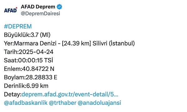 AFAD’dan yapılan açıklamada sarsıntının merkezüssü İstanbul Silivri olarak açıklanırken büyüklüğü ise 3.7 olduğunu belirtildi.