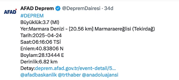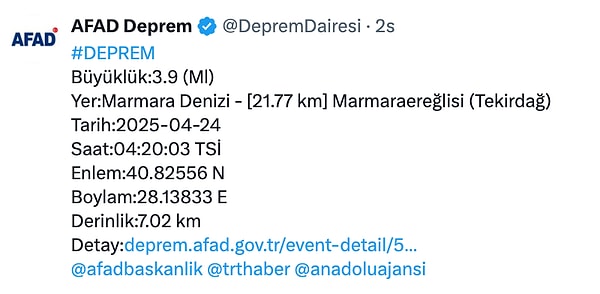 AFAD, sarsıntının merkezüssünün Tekirdağ olduğunu belirtirken derinliğinin 7.02 km büyüklüğünün ise 3.9 olduğunu açıkladı.