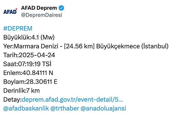 AFAD’dan yapılan açıklamada saat 07:19’da Büyükçekmece’de 4.1 büyüklüğünde zelzele meydana geldi.