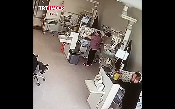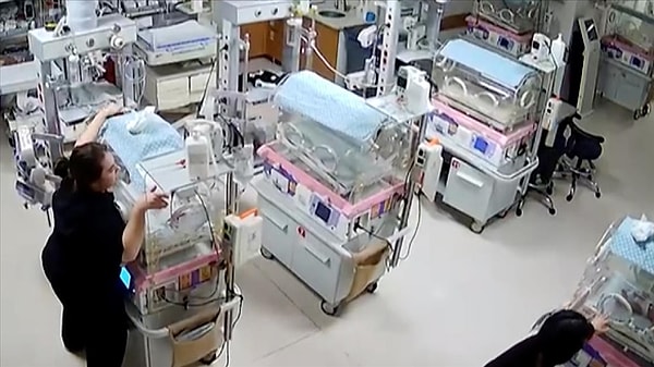 Depreme bir hastanenin yenidoğan servisinde yakalanan iki hemşire, depremi fark eder etmez bebeklerin yanına koştu. Ağır bakımda tedavi gören bebeklerin başından ayrılmayan iki hemşirenin o anları hastanenin kamerasına yansıdı.