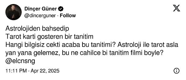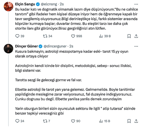 Elçin Sangu’nun yeni programının tanıtımına Astrolog Dinçer Güner’in yorumu ve tarot kartlarıyla yapılan tanıtıma reaksiyon göstermesi X’in gündemine kısa müddette oturdu. Elçin Sangu yapılan yorumların akabinde verdiği karşılıklarla bahis bir oldukça uzadı.