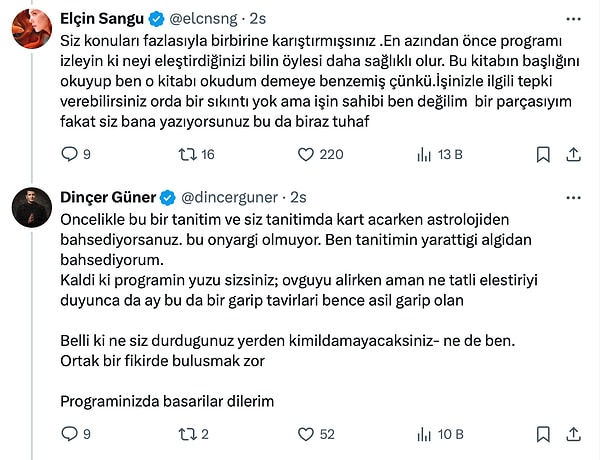 Astrolog Dinçer Güner ise Elçin Sangu’nun cevabına karşılık, “Programın yüzü sizsiniz, ancak bu tanıtımda yapılan kusur algı yaratıyor,” diyerek tenkitlerini sürdürdü.