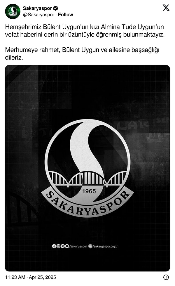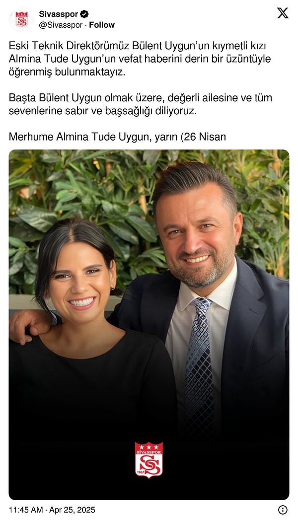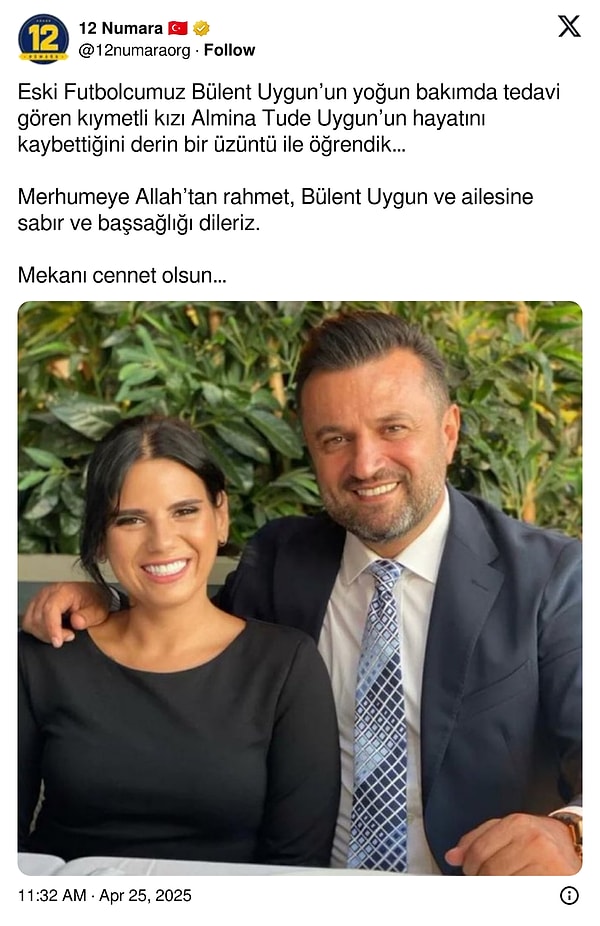 Teknik yönetici Bülent Uygun’un kızı Almina Tude Uygun hayatını kaybetti.