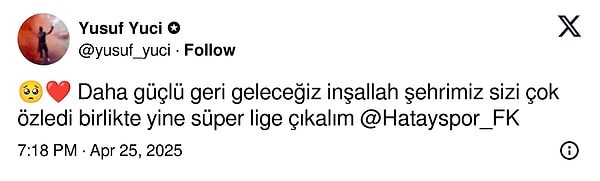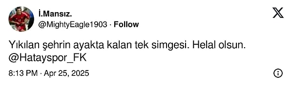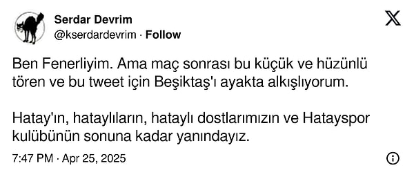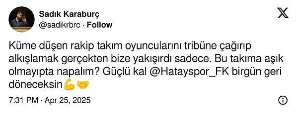 Desteğimiz her vakit Hatay halkıyla.’ dedi. Taraftarlar ise bu duygusal vedaya alkışlarla takviye verdi.