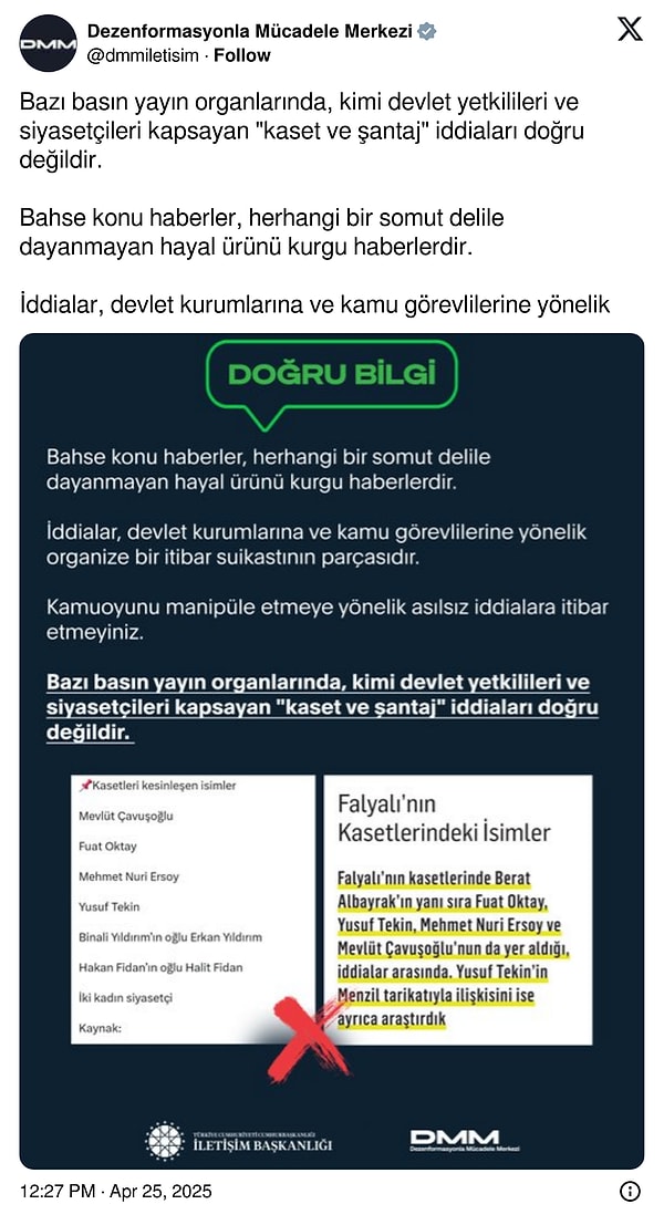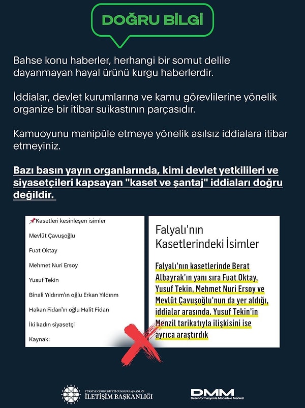 İletişim Başkanlığı’na bağlı Dezenformasyonla Çaba Merkezi, gündemi meşgul eden kaset ve şantaj tezlerine ait resmi toplumsal medya hesabından açıklama yaptı.