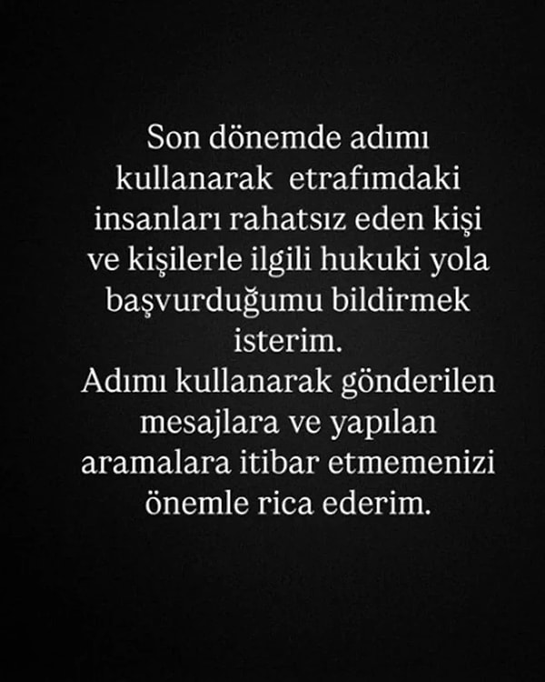 Ünlü oyuncu, toplumsal medya hesabında yaptığı açıklamada “Son vakitlerde adımı kullanarak etrafımdaki insanları rahatsız eden kişi yahut bireyler hakkında türel süreci başlattığımı bildirmek isterim. Adımı kullanarak gönderilen iletilere ve yapılan aramalara prestij etmemenizi kıymetle rica ederim” diye yazdı.