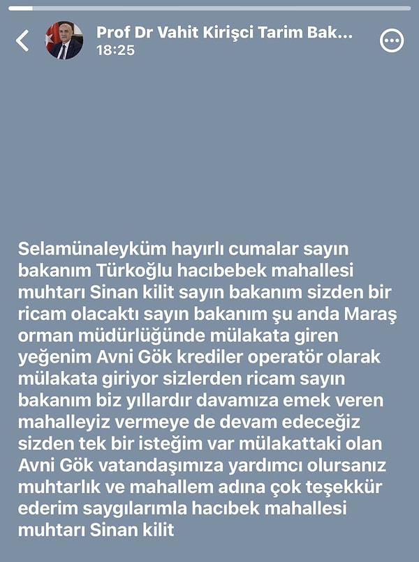 Torpil isteğinde bulunan kişinin Kahramanmaraş Türkoğlu ilçesine bağlı Hacıbebek Mahallesi Muhtarı olduğu görüldü.