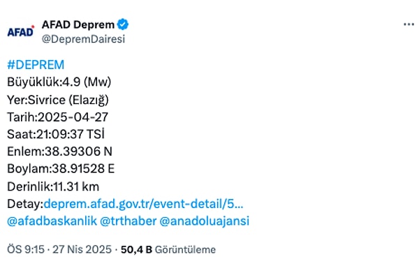 AFAD zelzeleyle ilgili paylaşımında şu bilgilere yer verdi: