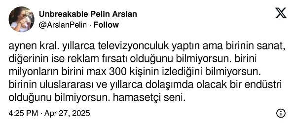 Aradaki fark 1 milyon 980 bin lira farkı ben size açıklıyorum; arkadaş kabız vaziyette, kabız olarak kamera önünde. Ben rahatlamış vaziyette, kollarımı açmışım seyirciyle beraberim. Ne yaptığın değil, nasıl ne kazandığın değerli değil. Nasıl yaşadığın değerli. Seyircimle yaşıyorum. Arkadaş şey yapıyor, ‘Benim şu kanalda dizim başlıyor, seyret ‘Öbürü de diyor ki ‘Benim de şu kanalda dizim başlıyor, sen de onu seyret’ Kimsenin umurunda değil bunlar. Kimsenin umurunda değiller. Samimi söylüyorum size. Kimi yaşlı mesken hanımları var, çok yaşlı. Onlar kimin hangi dizide oynadığını biliyor. Gerisi takip edemiyor. Zira o dizi batıyor, bu dizi başlıyor’ tabirlerini kullandı.