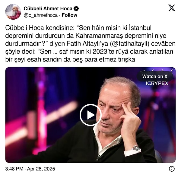 “Cübbeli Hoca kendisine: “Sen hain misin ki İstanbul sarsıntısını durdurdun da Kahramanmaraş zelzelesini niçin durdurmadın?” diyen Fatih Altaylı’ya cevâben şöyle dedi: “Sen saf mısın ki 2023’te hayal olarak anlatılan bir şeyi essah sandın da beş para etmez tırışka sitelerin haberlerine aldanarak bu türlü konuşuyorsun?