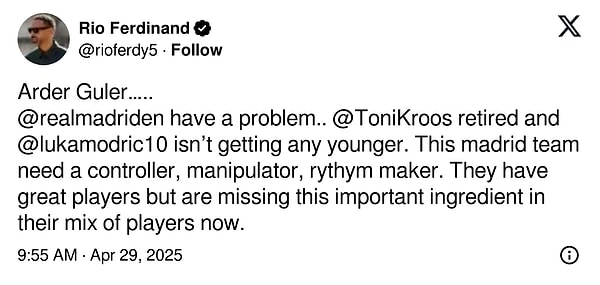 İspanya Kral Kupası’nda Barcelona’ya 3-2 mağlup olan Real Madrid’de teknik yönetici Ancelotti, tenkitlerin maksadı olmuştu. İtalyan teknik adamın dönem başından bu yana yaptığı oyuncu tercihleri sıkça sorgulanırken, Arda Güler’in ezeli rakip Barcelona karşısındaki oyunu herkesin beğenisini kazanmıştı. Manchester United’dan tanıdığımız eski İngiliz futbolcu Rio Ferdinand, ulusal futbolcumuz hakkında Ancelotti’ye gönderme yaptı.