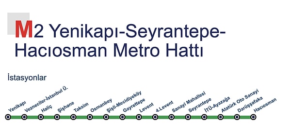 Yenikapı ile Hacıosman ortasında hizmet veren M2 metro çizgisinin hat uzunluğu 23,49 km’dir. Toplamda 16 istasyonda hizmet veren M2’de 192 adet araç bulunur. Metro haritası M2 ise üstteki görselde verilmiştir.