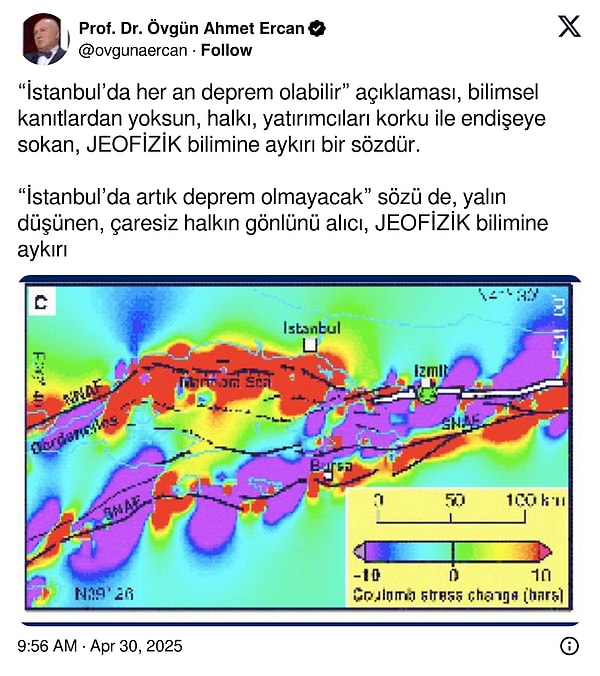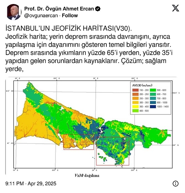 İstanbul’da gerçekleşen 6.2 büyüklüğündeki zelzelenin yankıları sürüyor. Zelzeleye dair her gün yeni bir açıklama yapılırken kelamlarıyla dikkat çeken Jeofizik Yüksek Mühendisi Prof. Dr. Ahmet Ercan, X hesabından yeni bir paylaşım yaptı. Ercan, paylaşımına “Lacivert en sağlam yerler, sarı riskli yerler” notunu düştü.