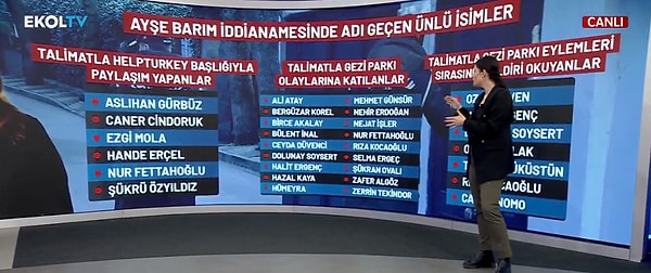 Savcılık, Ali Atay, Zafer Algöz, Bergüzar Korel, Mehmet Günsür, Şükran Ovalı, Nejat İşler üzere ünlü oyuncuların Ayşe Barım’ın talimatı ile Seyahat Parkı aksiyonlarına katıldığını, Ezgi Mola, Hande Erçel, Caner Cindoruk üzere isimlerin de tekrar talimatla orman yangıları sırasında “HelpTurkey” etiketi ile paylaşım yaptığını sav etti.