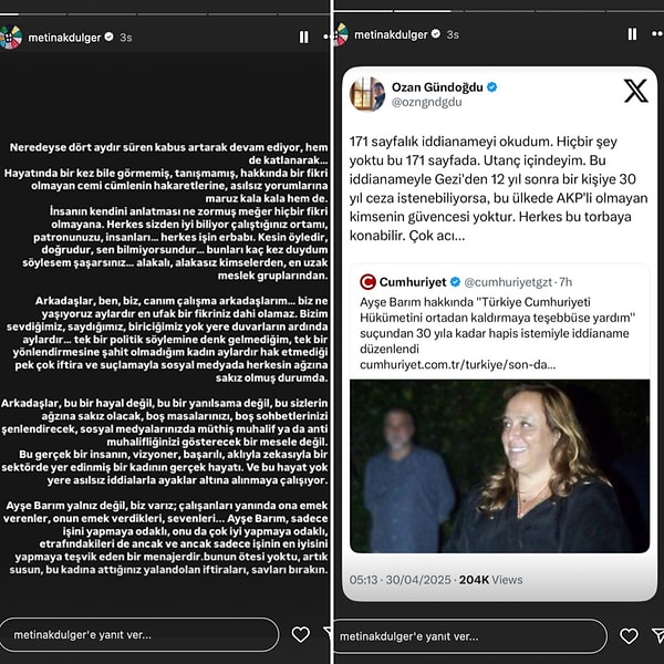 Ayrıca Ozan Gündoğdu isimli X kullanıcısının iddianameyi okuduğunu ve hiçbir şey bulamadığını vurguladığı tweet’i de öyküsünde paylaştı. 👇