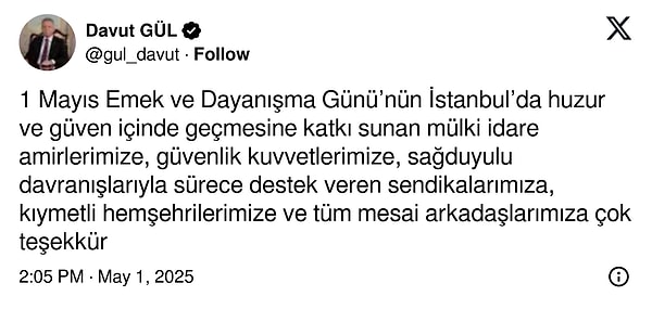‘1 Mayıs Emek ve Dayanışma Günü’nün İstanbul’da huzur ve inanç içinde geçmesine katkı sunan mülki yönetim amirlerimize, güvenlik kuvvetlerimize, sağduyulu davranışlarıyla sürece dayanak veren sendikalarımıza, değerli hemşehrilerimize ve tüm mesai arkadaşlarımıza çok teşekkür ediyorum.
