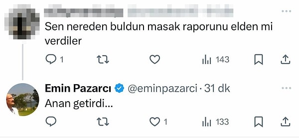 Kullanıcılardan biri olan @xxwadexx16’nın, “Sen nereden buldun MASAK raporunu elden mi verdiler?” sorusuna Pazarcı’nın cevabı, “Anan getirdi” oldu.