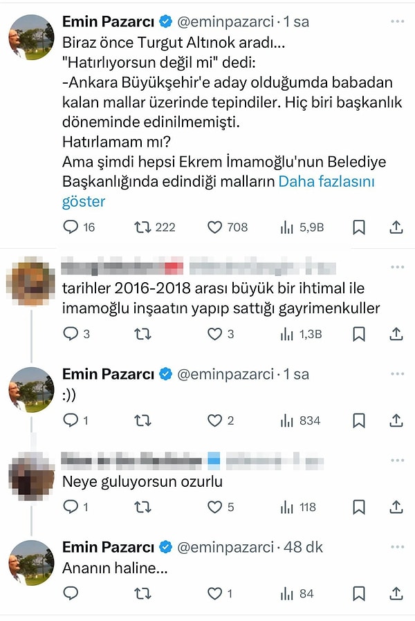 Pazarcı, Ekrem İmamoğlu’na ilişkin olduğu öne sürülen mal varlığı listesini paylaşarak, MASAK (Mali Suçları Araştırma Kurulu) raporu olduğunu tez ettiği belgeyi gündeme taşıdı. Emin Pazarcı’nın paylaşımlarına yorum yapan birçok kullanıcı, evraklarda yer alan bilgilerin, inşaat bölümünde faaliyet gösteren bir iş insanı için olağan ticari süreçler olduğunu belirtti. ,