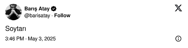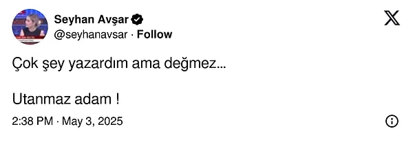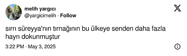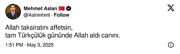 İyi Parti Kültür Sanat ve Gençlik Siyasetlerinden Sorumlu Genel Lider Yardımcısı Mehmet Aslan, X hesabından Sırrı Süreyya Başkan için ‘Allah taksiratını affetsin, tam Türkçülük gününde Allah aldı canını.’ yazdı.