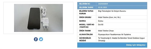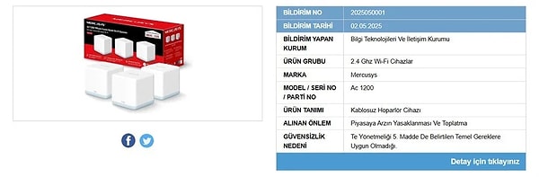 Bildirimin açıklama kısmında, eserlerin Telsiz Ekipmanları Yönetmeliği’nin birtakım hususlarındaki gereklere uymadığı belirtildi.