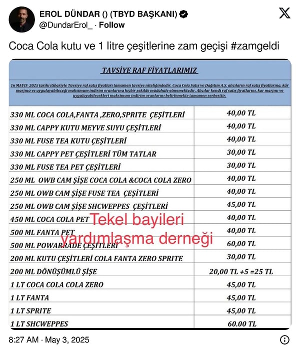 Yaz geldi, sofraların vazgeçilmezi olan gazlı içecekler de artırımdan nasibi aldı. İnhisar Bayileri Yardımlaşma Derneği Başkanı Erol Dündar, yeni fiyat listesini toplumsal medya hesabı X’ten paylaştı.