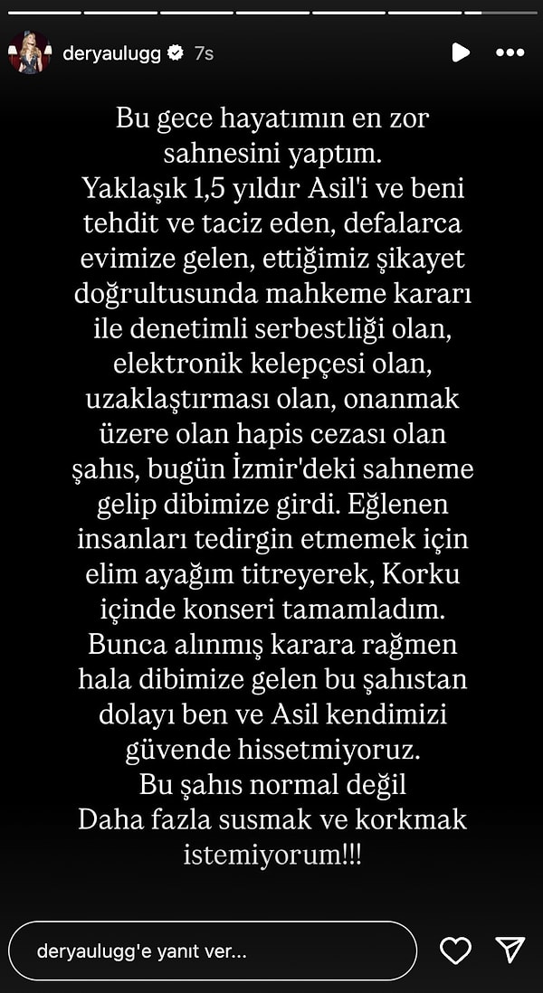 “Bu gece hayatımın en sıkıntı sahnesini yaptım. Yaklaşık bir buçuk yıldır Asil’e ve bana tehdit ve tacizlerde bulunan, tekraren konutumuza gelen, hakkında elektronik kelepçe ve uzaklaştırma kararı olan, hatta onanmak üzere mahpus cezası bulunan bir şahıs, İzmir’deki sahneme geldi. Tabanımıza kadar girdi. Eğlenen insanları huzursuz etmemek için elim ayağım titreyerek sahnemi tamamladım.”