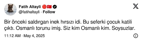 Altaylı, “Bir evvelki saldırgan inek hırsızı idi. Bu seferki çocuk katili çıktı. Osmanlı torunu imiş. Siz kim Osmanlı kim. Soysuzlar.” sözlerini kullandı.