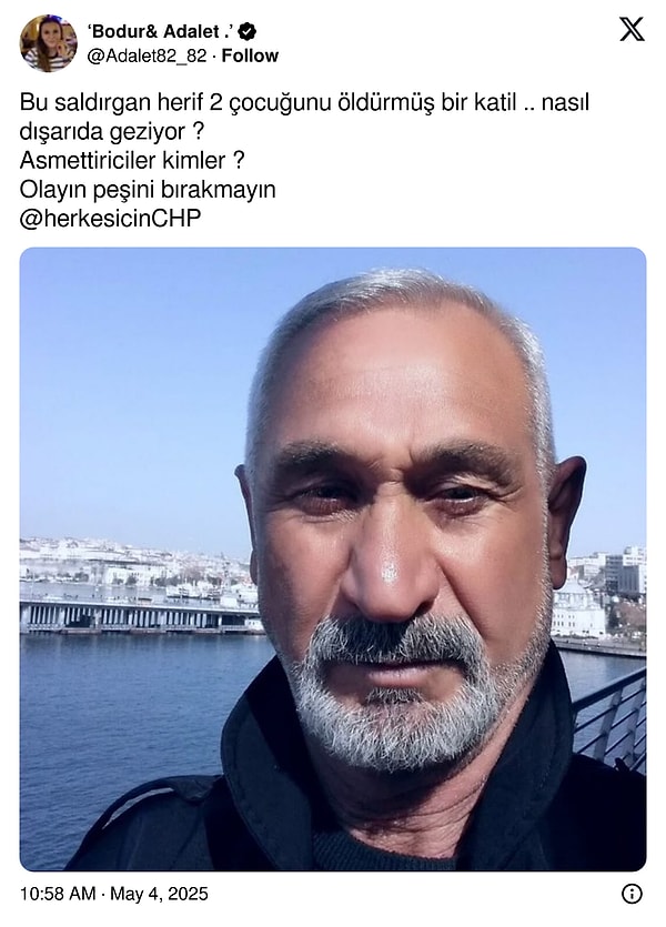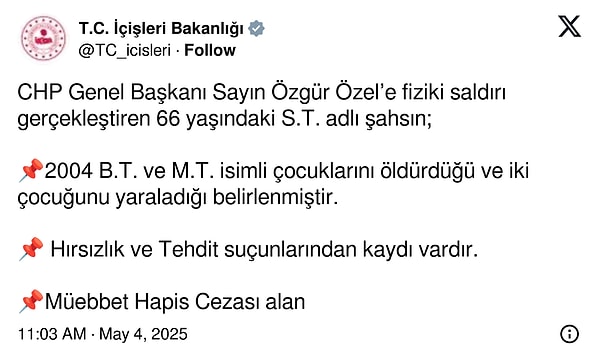 ‘CHP Genel Lideri Sayın Özgür Özel’e fiziki atak gerçekleştiren 66 yaşındaki S.T. isimli şahsın;