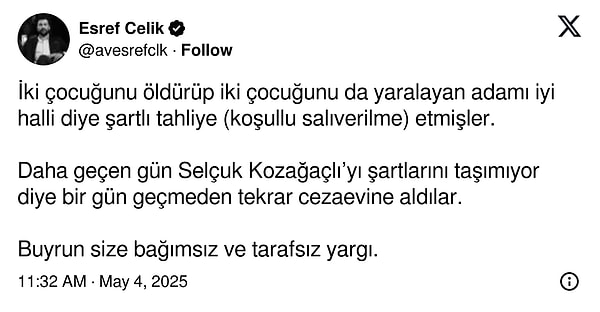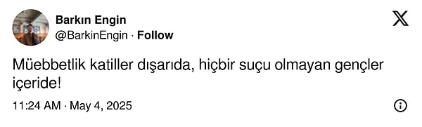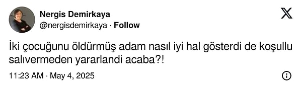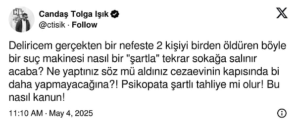 Tengioğlu, müebbet mahpus cezası almıştı lakin 2020 yılında şartlı tahliye ile hür bırakıldı.