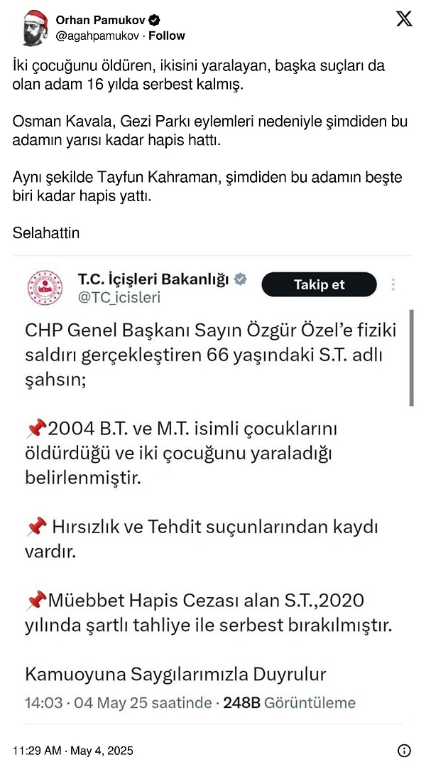 CHP Genel Başkanı Özgür Özel’e AKM’de Sırrı Süreyya Lider için düzenlenen merasimde taarruz düzenlendi. Özel, merasim alanından ayrılırken bir şahsın yakın saldırısına uğradı. Özel’e yumruk atan şahsın kimliği muhakkak oldu ve şahsın sabıkası da ortaya çıktı. İçişleri Bakanlığı, saldırganın kendi çocuklarını öldürdüğünü, iki çocuğunu da yaraladığını ve hırsızlıktan, tehdit kabahatlerinden da kaydı olduğunu doğruladı.