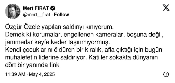 Özgür Özel’in bugün uğradığı taarruz hem ülkemizde hem de yurt dışındaki ülkelerde geniş yankı uyandırdı. Yaşanan olaya reaksiyon gösteren ünlülerimizden birisi de oyuncu Mert Fırat oldu.