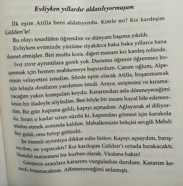‘Evliyken yıllardır aldatılıyormuşum. Bu olayı tesadüfen öğrendim ve dünyam başıma yıkıldı. Evliyken konutumuzda yüzüme riyakarca baka baka bana ihanet etmişler. Biri memnun koca, başkası temiz kız kardeş rolünde.’ itirafında bulundu.
