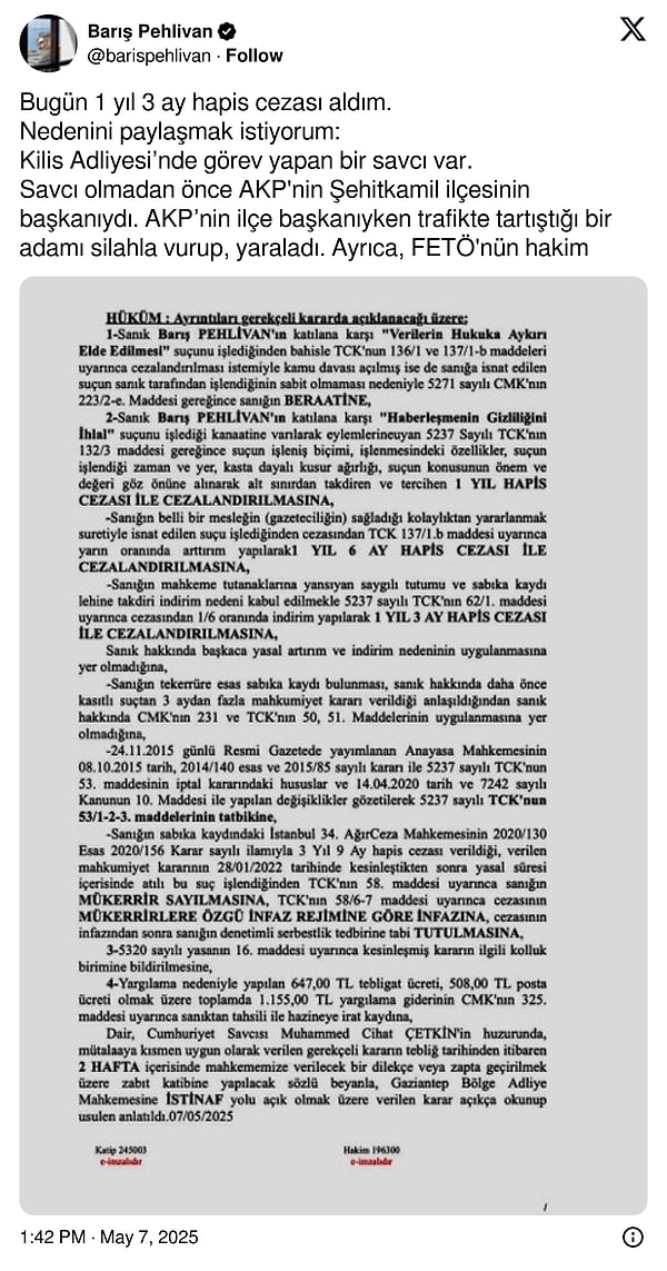 Gazeteci Barış Pehlivan, yargılandığı bir davadan 1 yıl 3 ay mahpus cezasına çarptırıldı. Mahpus cezası aldığını X hesabından duyuran Pehlivan, bunun münasebetini anlattı.