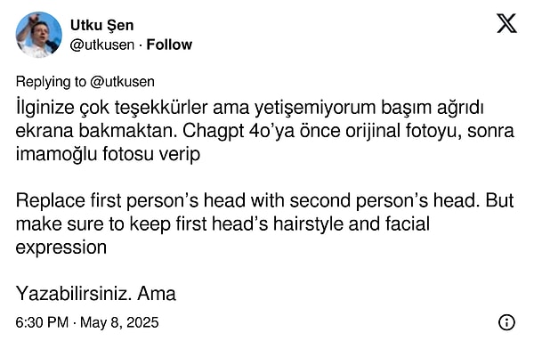 ChatGPT 4o ile yapılan görseller için beklenen ‘promt’ ise Utku Şen isimli X kullanıcısından geldi. İşte, ChatGPT ile Ekrem İmamoğlu ya da dilediğiniz bir kişinin görselini tasarlamanın yolu: