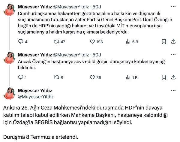 Gazeteci Müyesser Yıldız, Ümit Özdağ’ın hastaneye götürüldüğü için hakim karşısına çıkmadığını ve davasının 8 Temmuz’a ertelendiğini duyurdu.