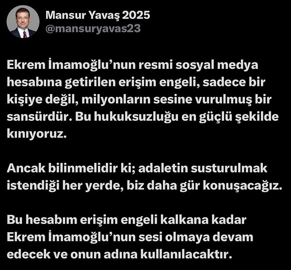 Türkiye sabaha tutuklu İBB Başkanı ve CHP’nin Cumhurbaşkanı Adayı Ekrem İmamoğlu’nun hesabının engellendiğini öğrenerek başladı. Tutuklandığından beri avukatları aracılığıyla paylaşımlar yapan İmamoğlu’nun hesabının erişime engellenme sebebi ise geçtiğimiz günlerde yaptığı bir paylaşım. Erişim manisi nedeniyle pek çok kişi karara reaksiyon gösterirken birçok isim de profil fotoğrafını Ekrem İmamoğlu yaptı.