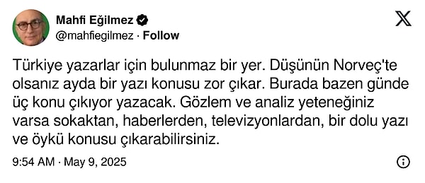 Eğilmez, paylaşımında ‘Türkiye müellifler için bulunmaz bir yer. Düşünün Norveç’te olsanız ayda bir yazı konusu sıkıntı çıkar. Burada bazen günde üç husus çıkıyor yazacak. Müşahede ve tahlil yeteneğiniz varsa sokaktan, haberlerden, televizyonlardan, bir dolu yazı ve hikaye konusu çıkarabilirsiniz’ dedi.