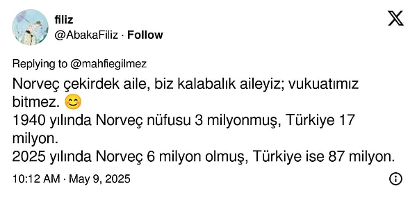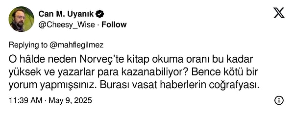 Eğilmez’in bir takipçisi bu paylaşıma şu soruyu yöneltti: ‘O hâlde neden Norveç’te kitap okuma oranı bu kadar yüksek ve muharrirler para kazanabiliyor? Bence makûs bir yorum yapmışsınız. Burası vasat haberlerin coğrafyası.’