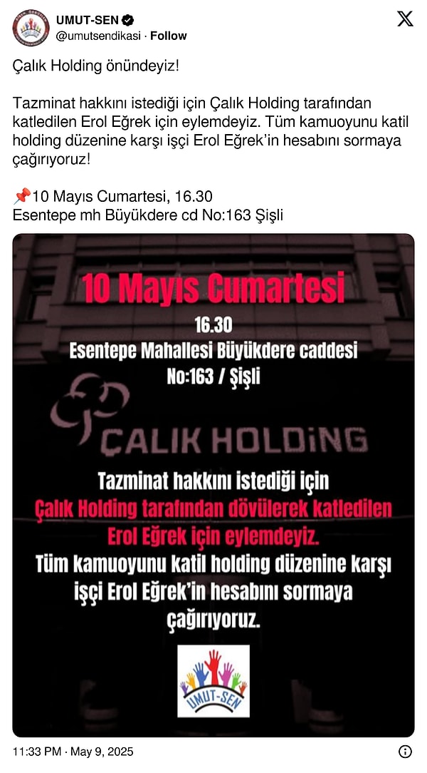 Tazminat hakkını istediği için Çalık Holding tarafından katledilen Erol Eğrek için eylemdeyiz. Tüm kamuoyunu katil holding tertibine karşı personel Erol Eğrek’in hesabını sormaya çağırıyoruz!