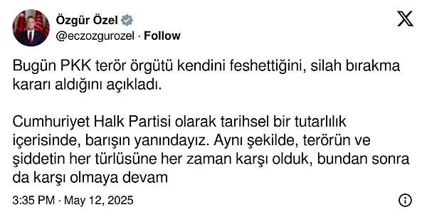 CHP Genel Başkanı Özgür Özel de PKK’nın çok konuşulan açıklaması ile ilgili birinci yorumunda bulundu.