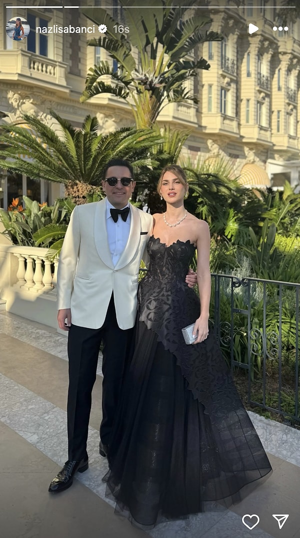 Nazlı Sabancı da davetten paylaşımlar yapmadan duramadı. Biricik eşini koluna taktı kameralara poz verdi.