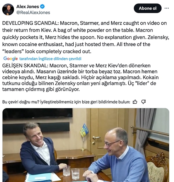 Fransa Cumhurbaşkanı Emmanuel Macron, İngiltere Başbakanı Keir Starmer ve Almanya Başbakanı Friedrich Merz hakkında toplumsal medyada dikkat çeken bir argüman gündeme geldi. Hususa ait birinci paylaşımı, komplo teorileriyle bilinen Amerikalı yayıncı Alex Jones yaptı.