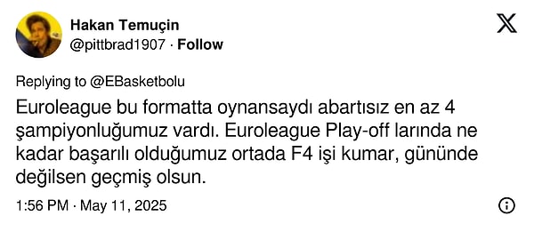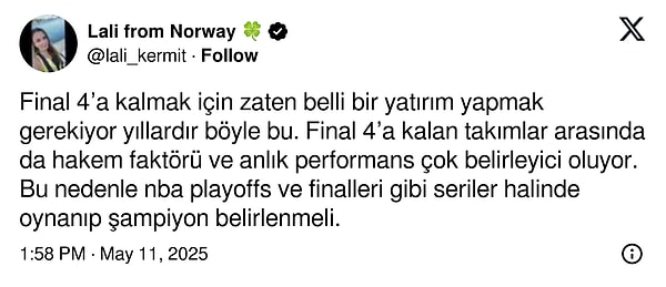 Ben Final-Four’un olmasına çok çok karşıyım. Sen lig misin, kupa mısın kardeşim ? Dönem boyunca 40 tane maç oynuyorsun sonra tek maçta bahtını belirliyorsun dönemin. O tek maçta ne olacağını hiç bilemezsin.