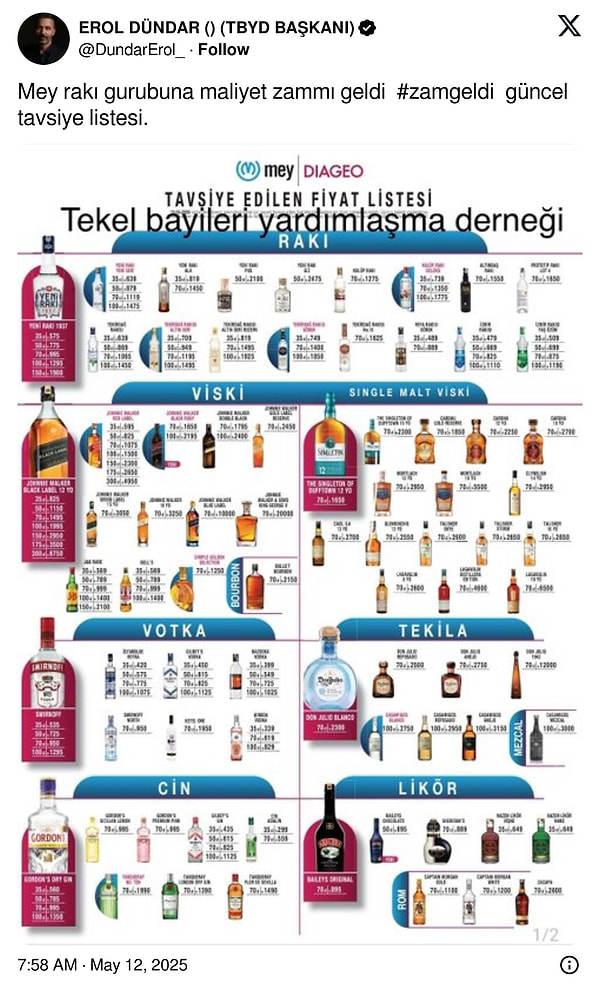 Dündar’ın paylaşımına nazaran yeni rakı fiyatları:
